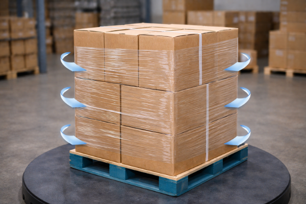 Благодаря этому она создает постоянное удерживающее усилие вокруг паллет. Это усилие помогает стабилизировать коробки и предотвращает их смещение.