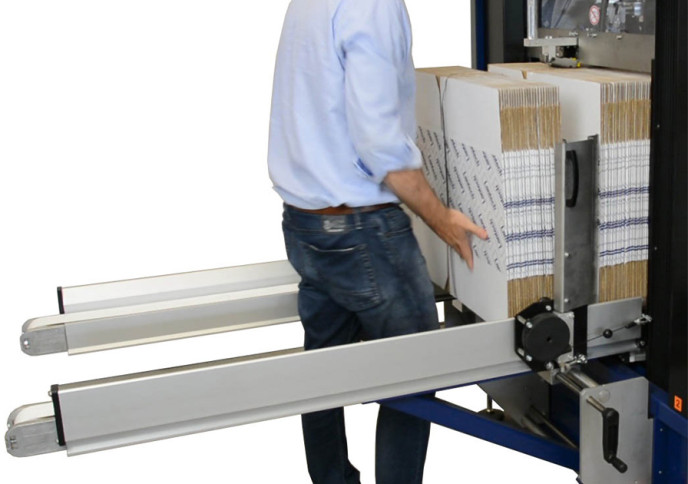 Толкатель, размещенный параллельно задней стенке короба, продвигает его в подпружиненные приводные ремни, которые компенсируют колебания ширины, и перемещают его через заклеивающее устройство.